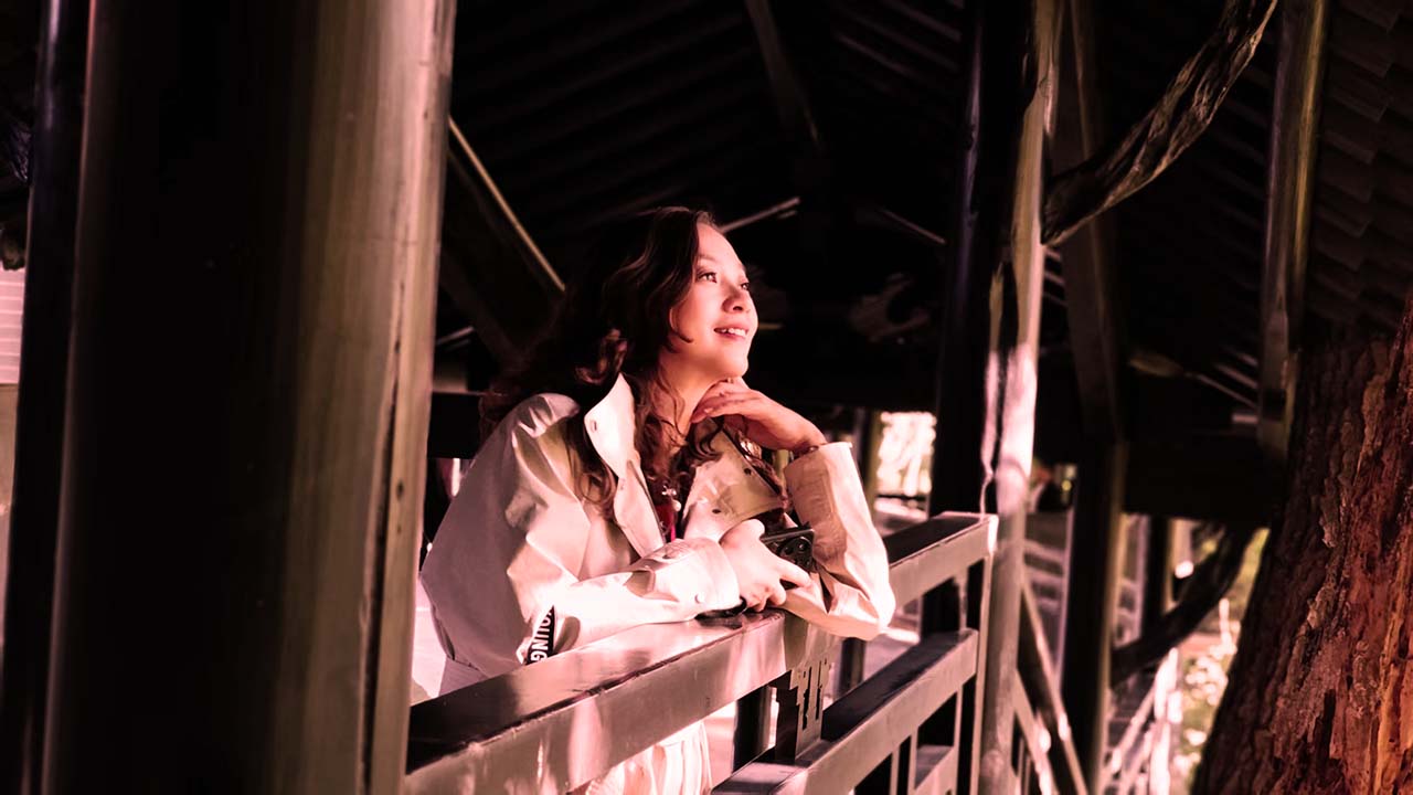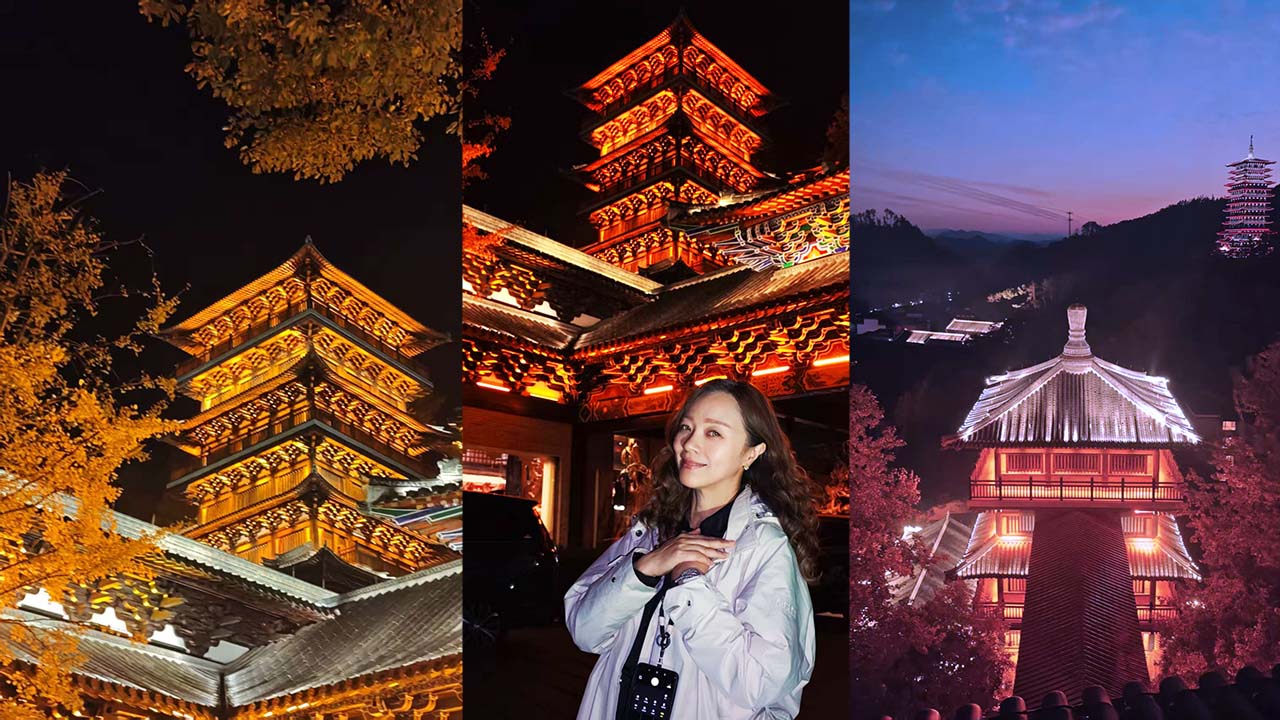 窗外天色已暗,這座在山間的唐代古建築款式的大酒店已亮起了燈,雕樑畫棟,飛簷翹角,青磚黛瓦,還有古塔,魅惑紅與璀燦金相間的色澤,誘惑我走出房門奔向戶外,醉在那抹鮮豔裡。好似我也換上了古裝,走進大唐盛世場景。或是,根本我已經穿越到了另一個時空? 即使仍身穿時裝,在燈影相映下,眼神已蕩漾,連步伐都有點飄。場景迷幻,身影搖曳,倦意來襲,索性回房歇息,但建築也跟著幻化成迷宮,也或許是我太沒有方向感,幾度迷失在這些樹根間,繞了好幾個廊道,穿過幾個門廳,才找到屬於我的那條廊道,走過一間間樹屋,解鎖推門回到我那個被樹根托舉著的大床。當我穿著粉紅睡衣躺在床上,這可能是這棵樹中最有生命力的點綴了。